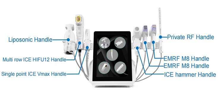 8. Multi row ICE HIFU12 i Single point ICE Vmax Različiti tretmani glave, prema različitim dubinama kože, odaberite različite uloške, koji mogu djelovati na različite dijelove, kao što su lice, vrat, prsa, ruke, bokovi, noge, trbuh itd.